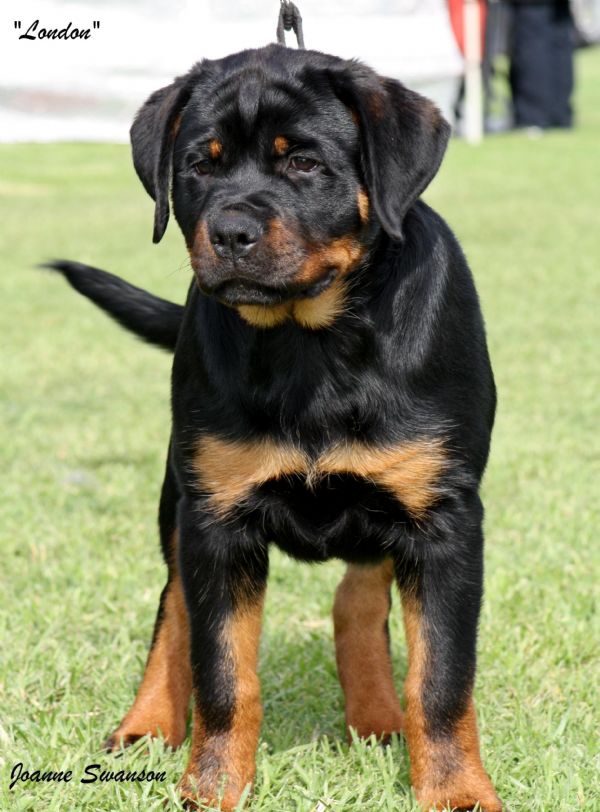 London is one of 8 pups in her litter of 4 males and 4 females. She is a strong and substantial pup, she has balanced angulations and she has a beautiful head with dark eyes and pigmentation.