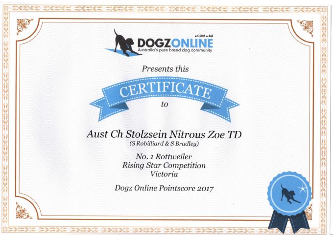 Zoe has had a great start to her show career, she has won multiple Class In Group at All Breeds Shows and has been awarded Class In Specialty Show at her first time out in the Specialty Ring at the Rottweiler Club Of Victoria Championship Show November 2016. She is now an Australian Champion with very limited showing and has achieved this with very strong adult competition by 13 months of age.